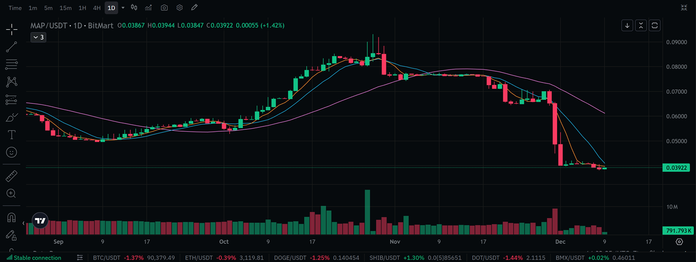 Looking at the 1D chart, we can clearly see: The price has bottomed out after the recent sharp decline, the MAP price has stabilized around the $0.03922 area. This is an extremely attractive price level, creating an ideal entry point with low risk and huge profit potential. The fact that the price is holding here shows that the buying force has started to absorb all the selling pressure.Increasing Buying Volume: Pay attention to the Volume column below! Although the price is moving sideways, we see that the buying volume columns (blue) are starting to appear more and are significantly larger.